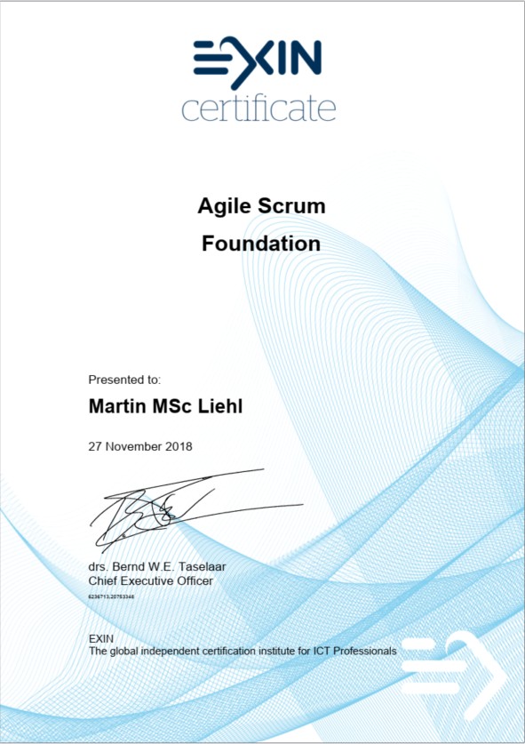 Mit diesem Zertifikat habe ich mein Projektverständnis erweitert und die Prinzipien von Scrum als Denkmodell für Teamführung und iterative Produktentwicklung in meine Praxis übernommen.
